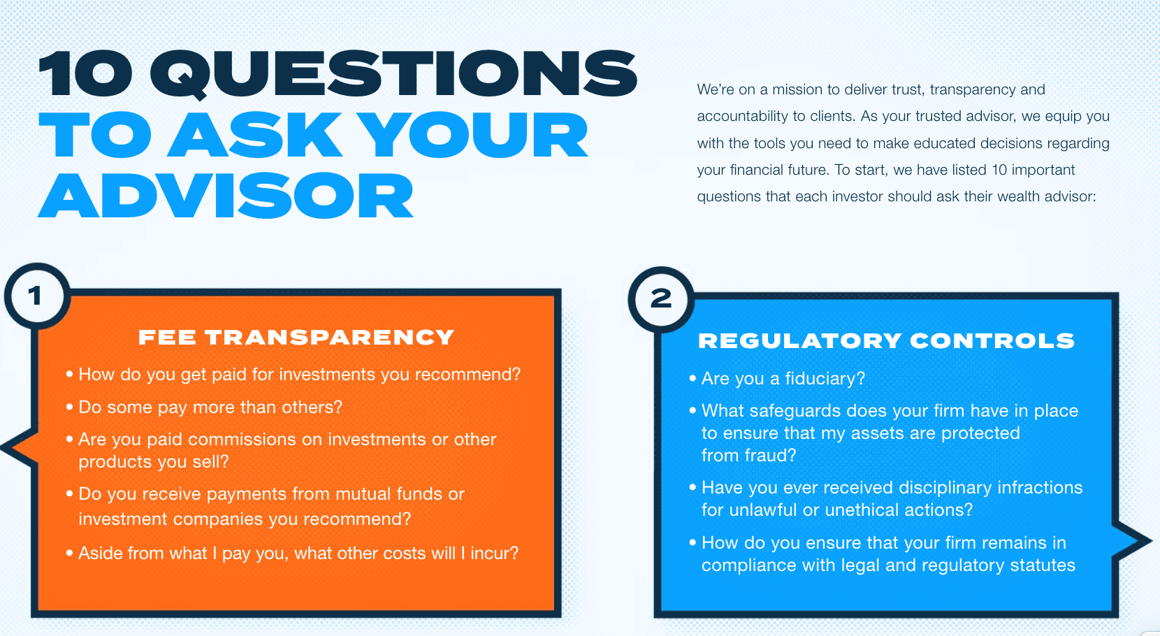 We’re on a mission to deliver trust, transparency and accountability to clients. As your trusted advisor, we equip you with the tools you need to make educated decisions regarding your financial future. To start, we have listed 10 Important Questions That Each Investor Should Ask Their Wealth Advisor.