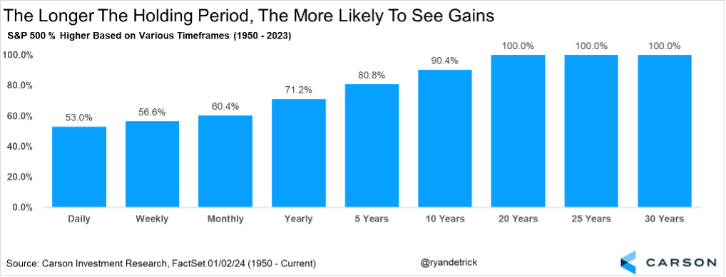 One of the wisest stock market sayings goes, “It is about time in the market, not timing the market.” Below shows how stocks tend to produce positive gains the longer you hold. Also, imagine the impact from buying when stocks are down (like many are now)? These returns likely only get even better.