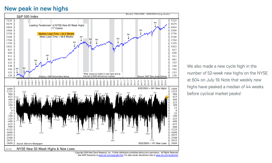 In mid-July we saw multiple buying thrusts, captured by seeing many stocks hitting 52-week highs, also inconsistent with a new bear market right around the corner. According to our friends at Ned Davis Research (NDR), on July 19 the New York Stock Exchange (NYSE) made a new cycle high of the number of stocks at their 52-week high. This matters, as historically the market hasn’t peaked for another 44 weeks after this has happened, on average. In other words, it would be quite rare for the number of highs to peak along with the price.