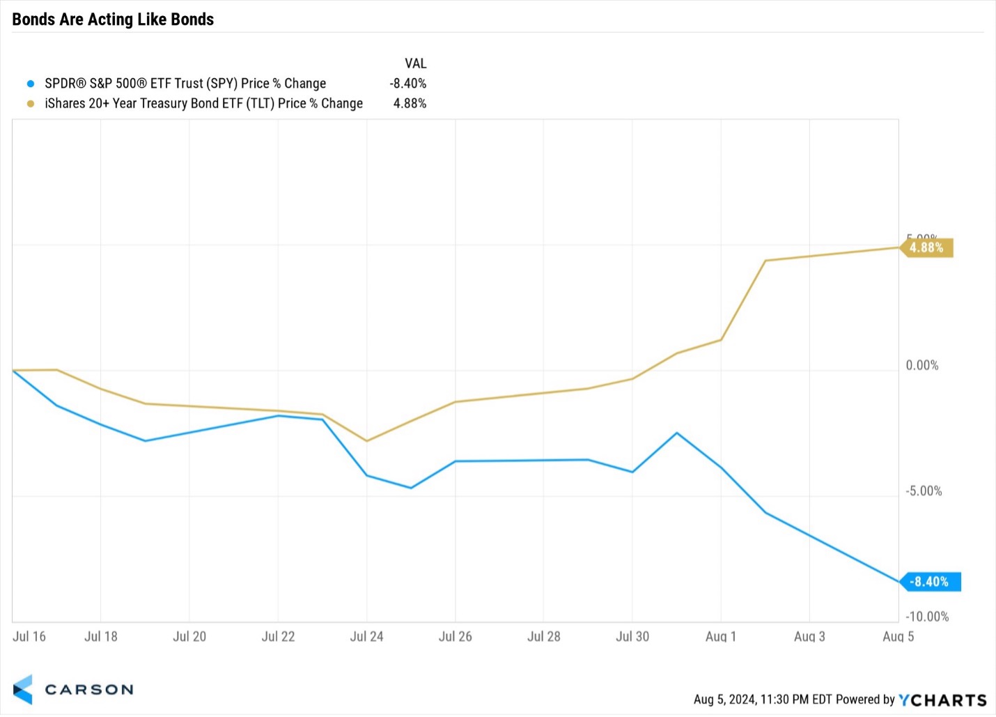 Since the S&P 500 peaked on July 16, it hasn’t been fun for stock investors. But did you know bonds were doing very well? It wasn’t that long ago, just in 2022, that both stocks are bonds were down more than double digits for the first time in history. Well, we appear to be moving back to more historical precedent with bonds zigging when stocks zag. In fact, since the S&P 500 peaked in July longer-term bonds were up close to 5%, while stocks were down more than 8%. That is a nice cushion for investors when they need it.