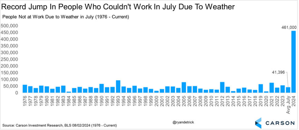 We do see some potential slowing, but we also think the reaction to the weaker-than-expected jobs number was overblown. For starters, 1.3 million households and businesses were still without power a full week after Hurricane Beryl. Adding to this, the state of Texas saw initial jobless claims double from the previous month and we saw a historic spike in temporary job losses. Lastly, 461,000 people said they couldn’t work due to weather in July, which was more than 10 times the July average. Seeing all these “one off” factors, we are optimistic many jobs will come back in August.