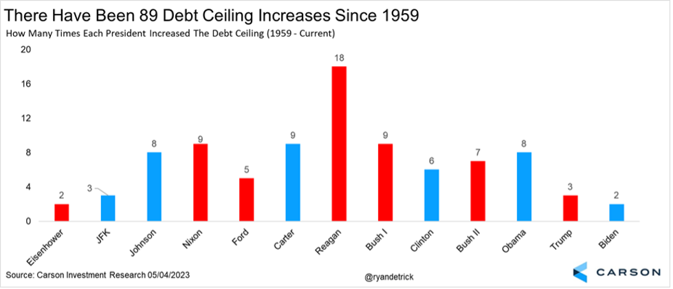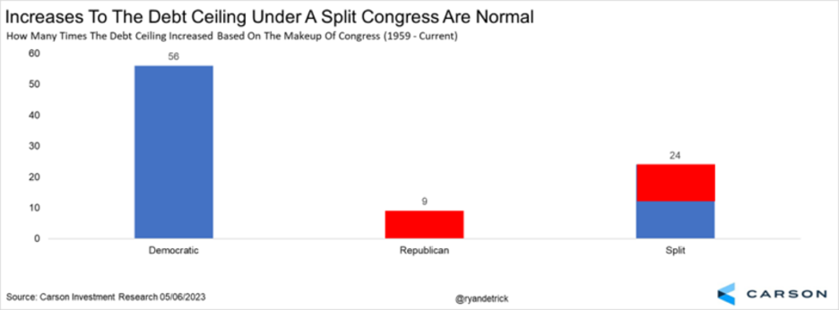 How likely is a deal? The Carson Investment Research team’s base case remains that there’s a big disconnect between the two sides right now, but the opportunity is there for some dealing with a final deal before the clock strikes midnight after the final posturing. Ultimately, it’s in neither President Biden’s nor Speaker McCarthy’s interest to see a default, and potential economic catastrophe, under their watch.