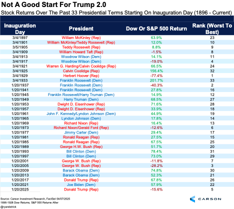 Speaking of bad returns, things haven’t done nearly as well in President Trump’s second term, or as I’ll call it Trump 2.0. The S&P 500 is down 15.6% since he took office. Looking at the past 33 presidential terms, this is the fifth worst start out of all of them. Yes, there is plenty of time left for this to improve, but still, this isn’t a good start.