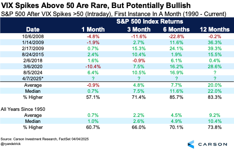 The VIX soared to above 60 Monday morning, hitting levels that have historically marked major bottoms for stocks. We’ll keep this simple, but when the VIX hits 50 for the first time in a month, it has probably been preceded by poor performance driven by panic, likely suggesting better times are coming. In fact, the S&P 500 has gained more than 20% on average a year later after the VIX spikes above 50.