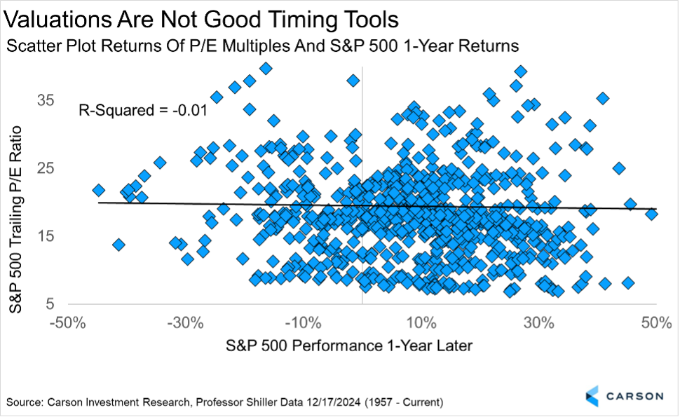 We absolutely pay attention to valuations, and the high valuations on technology is one of the reasons we didn’t come into 2025 overweight in this group like so many others. Still, you might be surprised to find out there is virtually no correlation between price-to-earnings (P/E) multiples and future stock performance over short time periods. We found S&P 500 trailing P/E multiples and one-year future returns have a correlation coefficient of virtually 0, suggesting there is no correlation between the two.