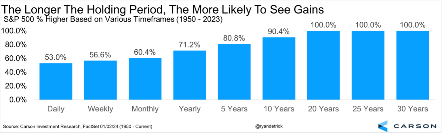 Our advantage as investors is time. We can be less concerned with day-to-day volatility when we take a longer-term approach to things. Doing this shows that it isn’t about timing the market, but about time in the market.