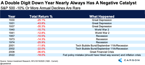 In fact, for the year to lose 10%, it usually takes some really bad news. As you can see in the table below, double-digit yearly declines nearly always have a major catalyst and we’ve only seen four of them since the turn of the century. Could tariffs be the driver for this to happen this year? Maybe, but only time can tell. For now, we feel a double-digit decline in 2025 will likely be a low-probability event.