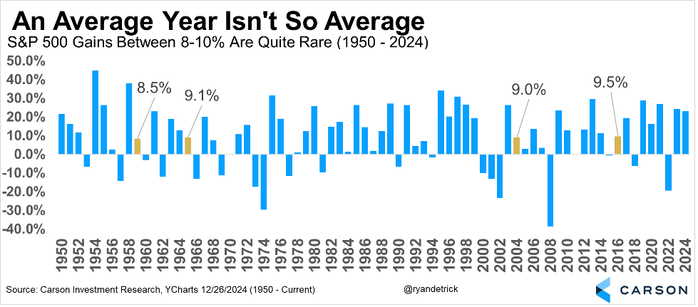 Along the same lines as above, the average year for the S&P 500 gains 9.5%, but a gain around that average is extremely rare. In fact, only four times going back 75 years have stocks finished 8–10%. Just know that larger moves are quite common—whether those moves are up or down.