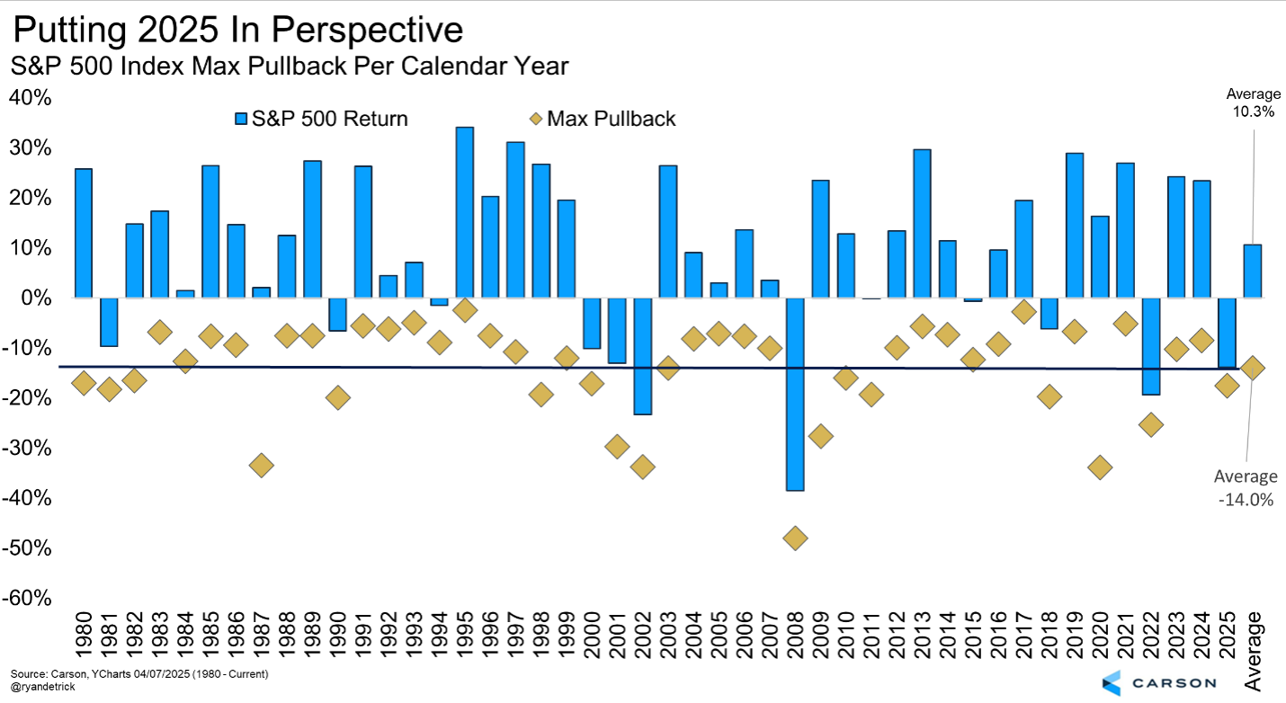 The current 17.6% correction sure feels like a lot, especially given that we didn’t have a 10% correction all of last year. But it turns out this is more common than you might think. Since 1980, we found the average peak-to-trough correction per year is 14.0%. Yes, this year has a long way to go, and things could get worse. But don’t forget that things could also get better.