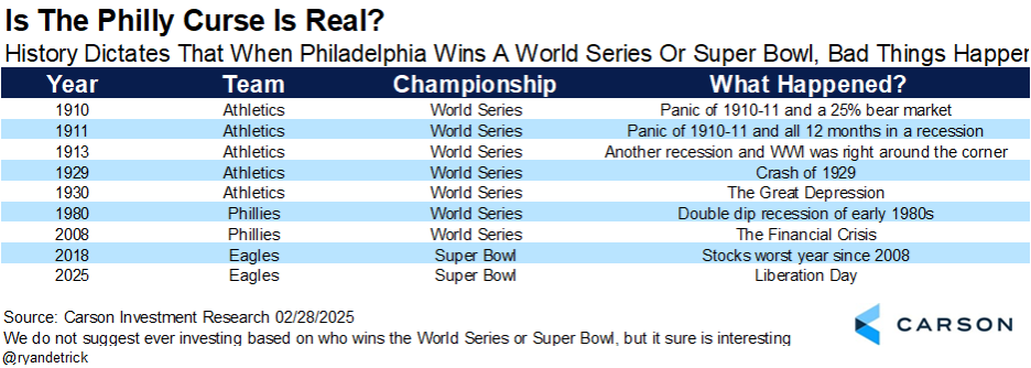 Could the Eagles winning the Super Bowl have been a bad sign? Each time the City of Brotherly Love has won a Super Bowl or World Series, bad things have happened. Sure enough, ever since the Eagles won in February, thing have been pretty bad. (Full disclosure: Don’t invest based on the Super Bowl, but this is interesting!)