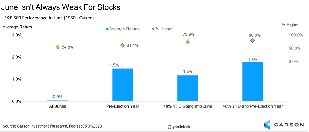 • Historically, June is not a great month for stocks, but a positive start to the year can lead to continued strength.