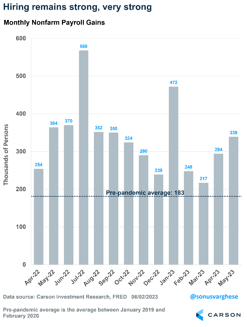 All in all, the labor market remains strong and resilient, despite the recession calls. Perhaps it’s not as strong as the headline payroll growth number of 339,000 suggests, but any number above 150,000 would be good at this point. And we’re certainly well above that.