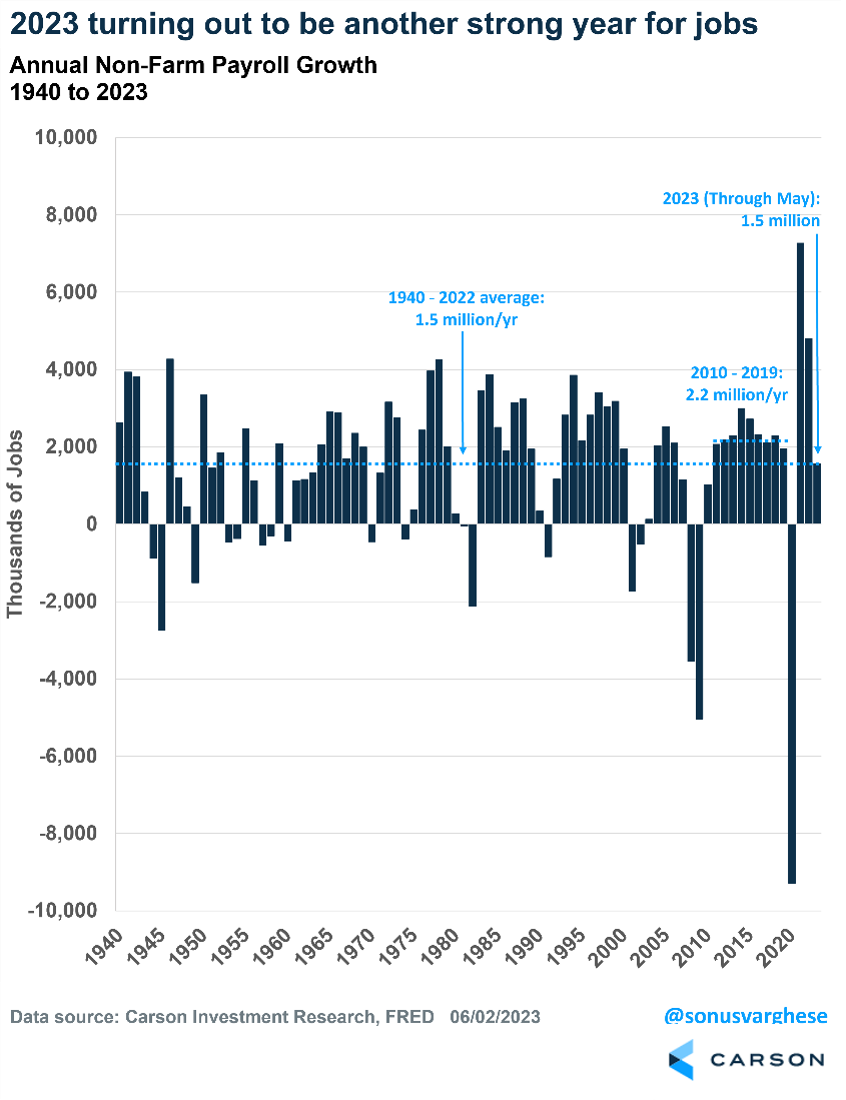 Over the first five months of the year, the economy added 1.5 million jobs. That is a strong indicator for how the economy is doing. For perspective, the average annual payroll growth between 1940 and 2022 was 1.5 million. During the last expansion, 2010-2019, average annual payroll growth was 2.2 million per year.