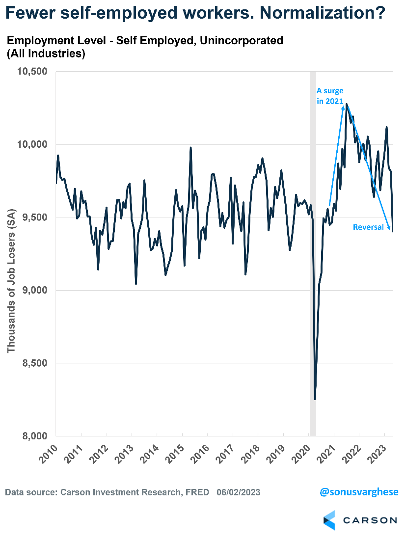 A big reason for the weak household survey (and rising unemployment rate) is that more than 400,000 people who were self-employed said they were no longer employed. As the following chart shows, this is very noisy data, but the trend seems to be toward lower self-employment. This is reversing the 2021 trend when self-employment surged. What we’re seeing now may simply be normalization of the labor market as more workers move from self-employment to W2 jobs with an employer.
