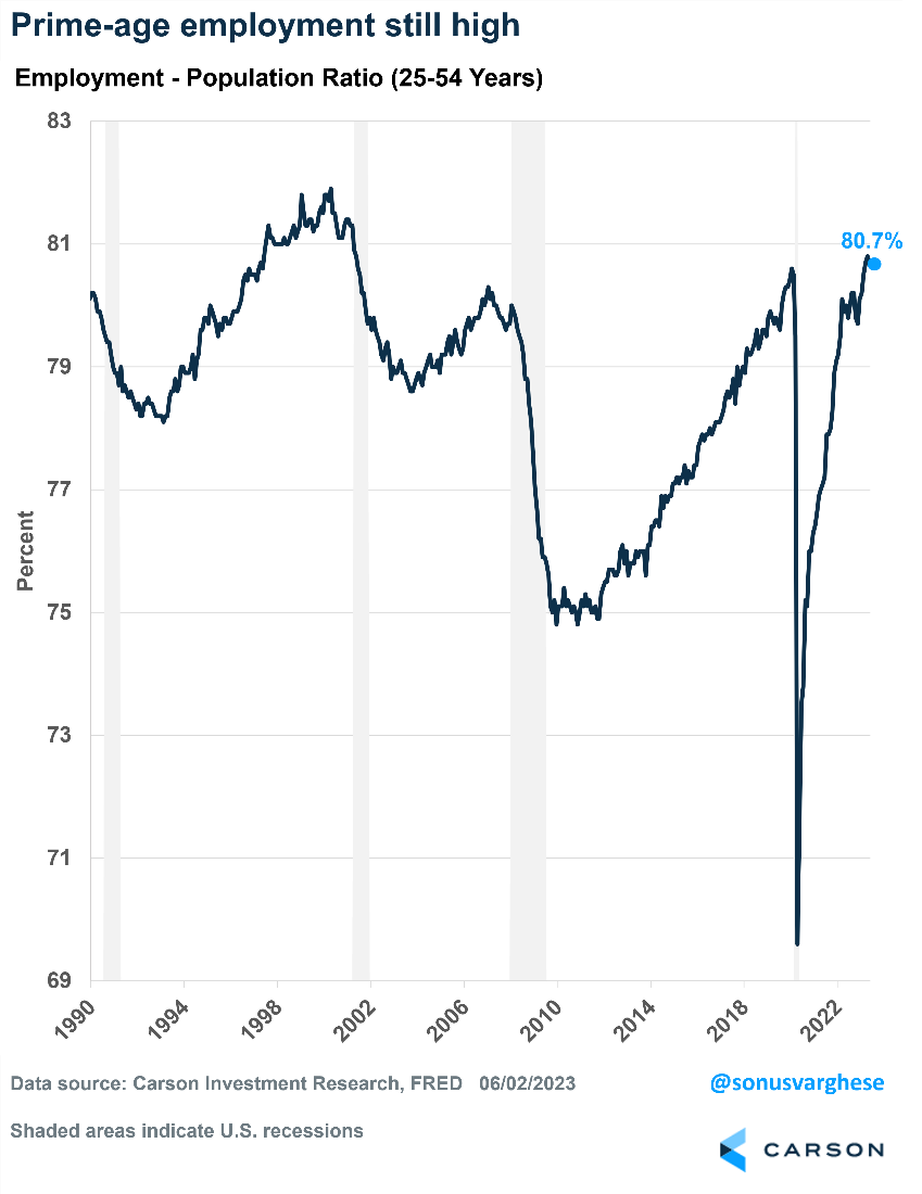 The unemployment rate can also be impacted by people leaving the labor force (technically defined as those “not looking for work”) and an aging population. We’ve previously discussed getting around this by looking at the employment-population ratio for prime age workers, i.e., workers aged 25-54 years. This measures the number of people working as a percentage of the civilian population. Think of it as the opposite of the unemployment rate. Prime age also circumvents demographic changes.