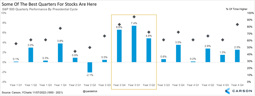 One of our favorite tables we’ve shared this year is right here. The first few quarters of a midterm year tend to be quite weak when looking at a 4-year presidential cycle, which played out all too well this year. The really good news is some of the best quarters are upon us, so don’t lose faith quite yet.