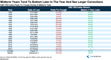 Should we be surprised that stocks have had a tough go so far in 2022? Maybe not, as this next chart shows the worst time for stocks is a midterm year under a new President. With the S&P 500 up only 2.4% on average these years, it helps put the disappointing year so far into perspective. Now check out what happens the following year, which might be something many investors could be smiling about soon enough.