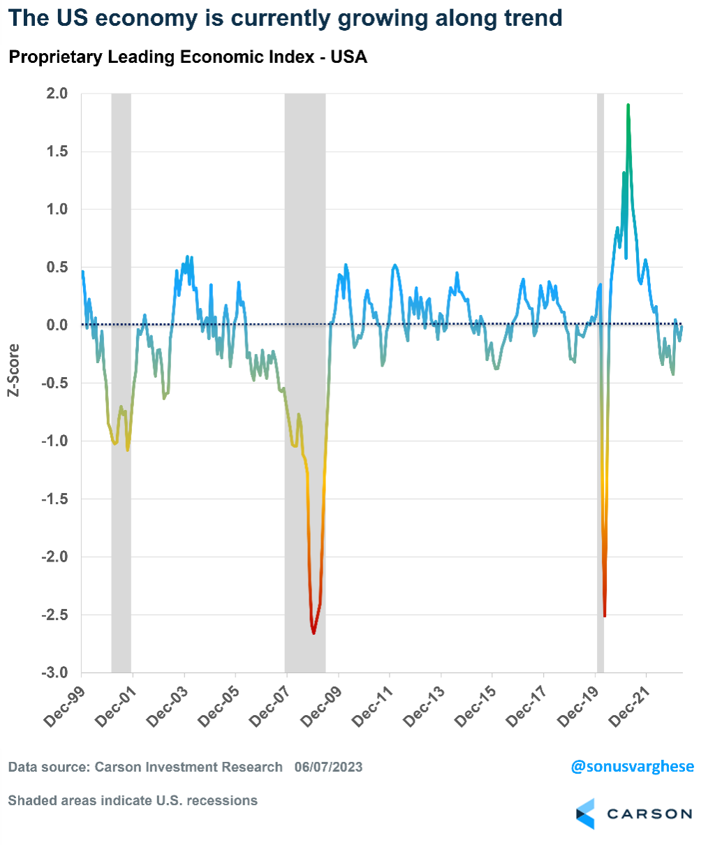 - Carson’s leading economic index indicates the economy is not in a recession.