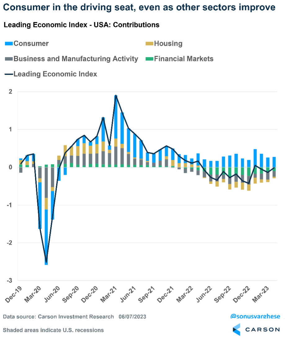 The good news is these sectors are improving even as consumer strength continues. The recovery in housing is notable. Additionally, the drag from financial conditions is beginning to ease as the Fed gets closer to the end of rate hikes.