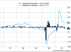 The most significant challenge for markets and the economy remains the supply shortages that are pressuring prices higher. U.S. industrial production shrank 1.3%. As Figure 1 shows, the monthly decline was larger than any seen from 2017 to 2019. Auto manufacturing dropped 7.2% last month, largely due to a shortage of semiconductor chips and other supply difficulties.