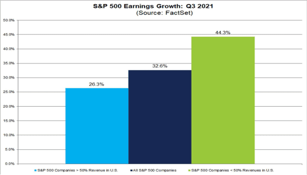 Also interesting is comparing companies in the S&P 500 that generate most of their revenue overseas with those that generate the majority in the United States. Given the disparity in economic recoveries, one might think that companies with more revenue coming from the U.S. would be doing better, but that’s not the case. The third-quarter earnings growth rate is 44.3% for companies that generate more than 50% of their revenue outside the U.S. and 26.3% for domestic-focused companies.
