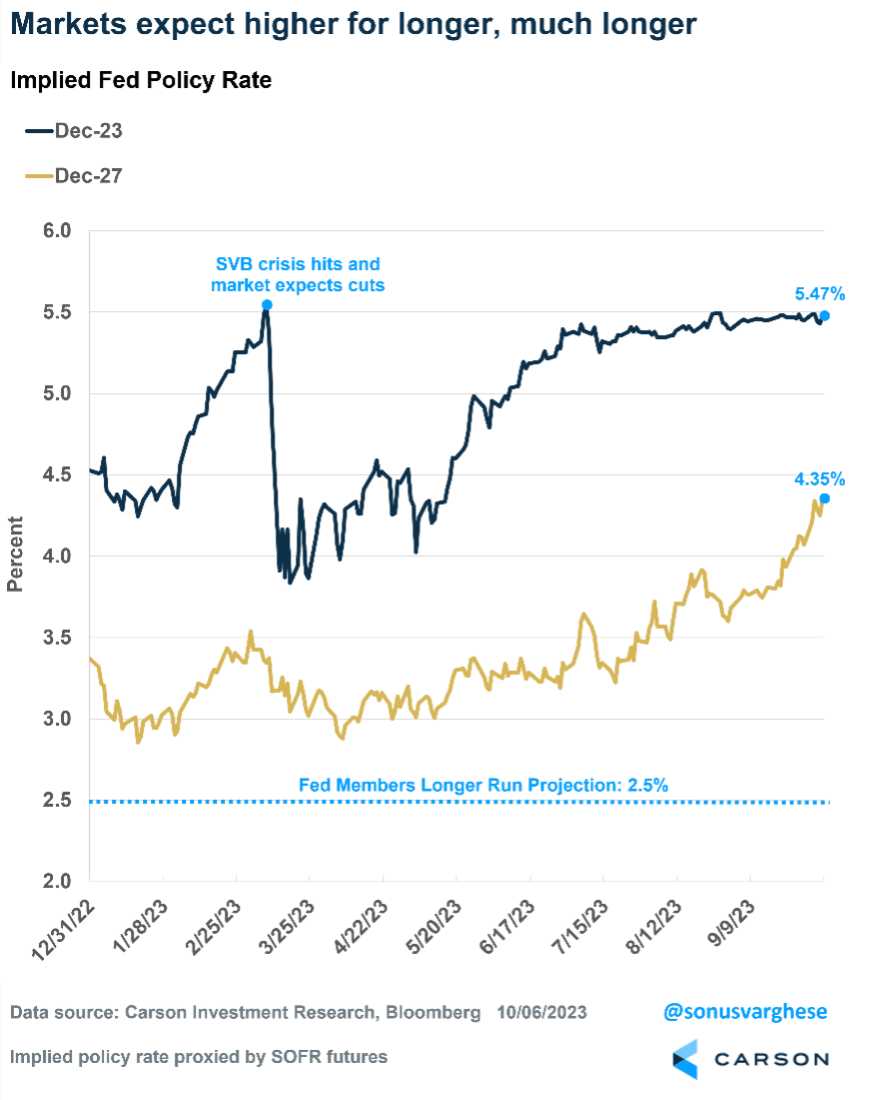 What’s interesting is that short-term interest rates haven’t budged. The market doesn’t think the Fed will raise rates again, which is why the implied policy rate expectation for 2023 has remained steady at 5.5%. Instead, as the chart below shows, the expected policy rate in 2027 has surged, from about 3% in May to 4.35% today. That’s a massive move, and it has happened because investors expect the Fed to keep rates higher well into the future.