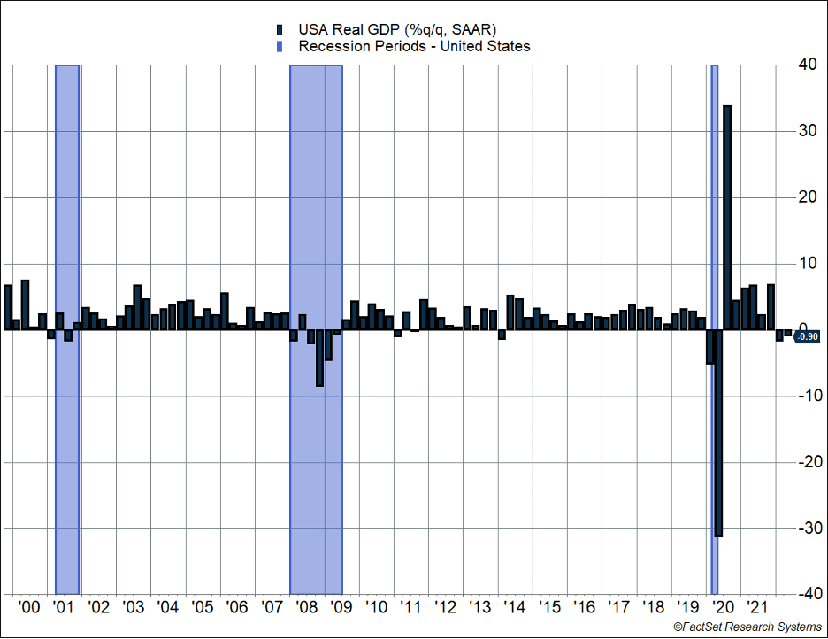 U.S. GDP shrank for the second consecutive quarter, contracting by 0.9%. Much of the economy remains strong, and services consumption continues to increase. Weakness in goods, inventories, housing, and government spending are contributing to signs the economy is slowing.