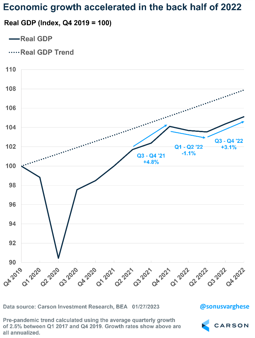 Over the full year, GDP growth was up just 1% compared to the end of 2021. But this hides the fact that economic growth picked up in the second half of 2022. However, the first-half slowdown leaves the economy about 2.5% below its pre-pandemic trend.