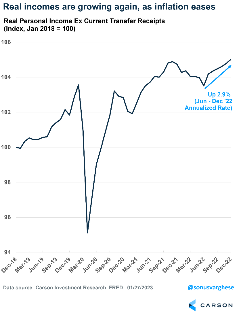 The good news is goods spending picked up in the fourth quarter and offset some of the services slowdown. This was almost entirely due to increased auto sales, gas, and grocery purchases — the latter two thanks to lower prices. This is important because we believe this trend will continue into early 2023, especially with auto sales and production picking up. Further good news: Consumers have more money in their pockets due to falling inflation, which will be a tailwind for consumption.