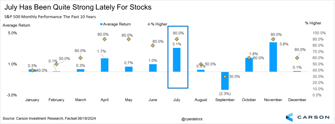 - July has been the best month of the year over the last 20 years and second best over the last 10.