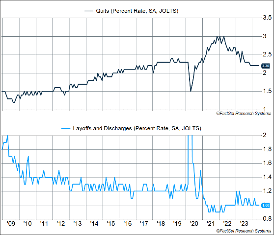 - Layoffs remain very low but the unemployment rate has been creeping higher.