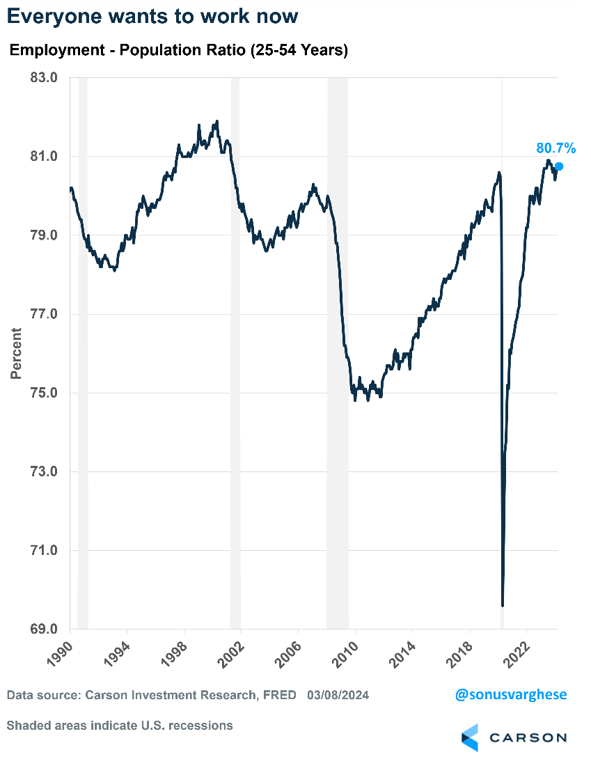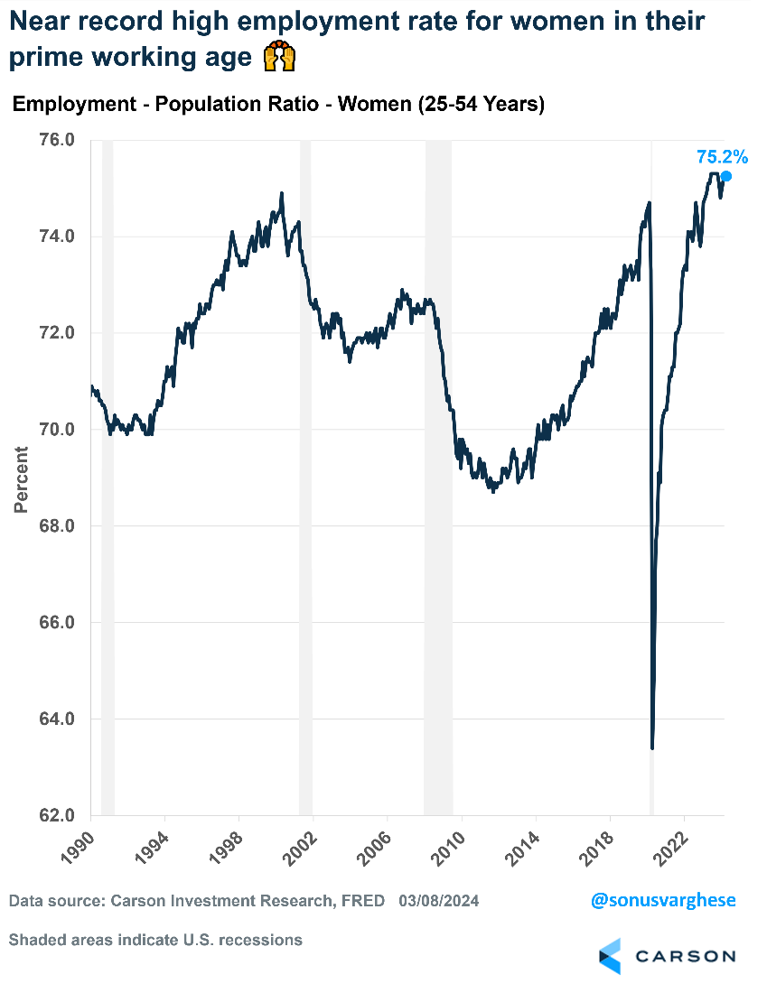 We’ll end with this. As mentioned above, the prime-age employment-population ratio is above anything recorded over the last two cycles. For women, that ratio is 75.2%, very close to the record high, a noteworthy statistic as we celebrated International Women’s Day last week.