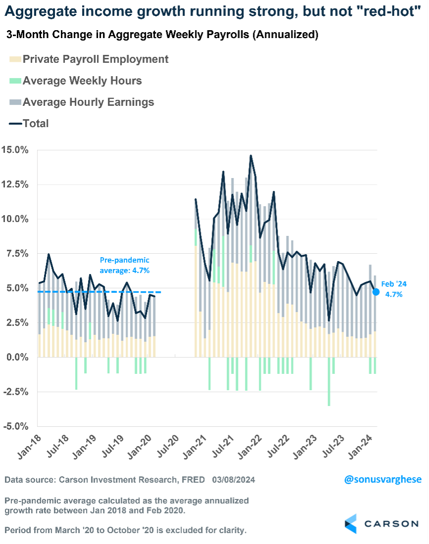 Even connecting the labor market to inflation, wage growth is not surging. To break it down, income growth across the economy is a sum of: