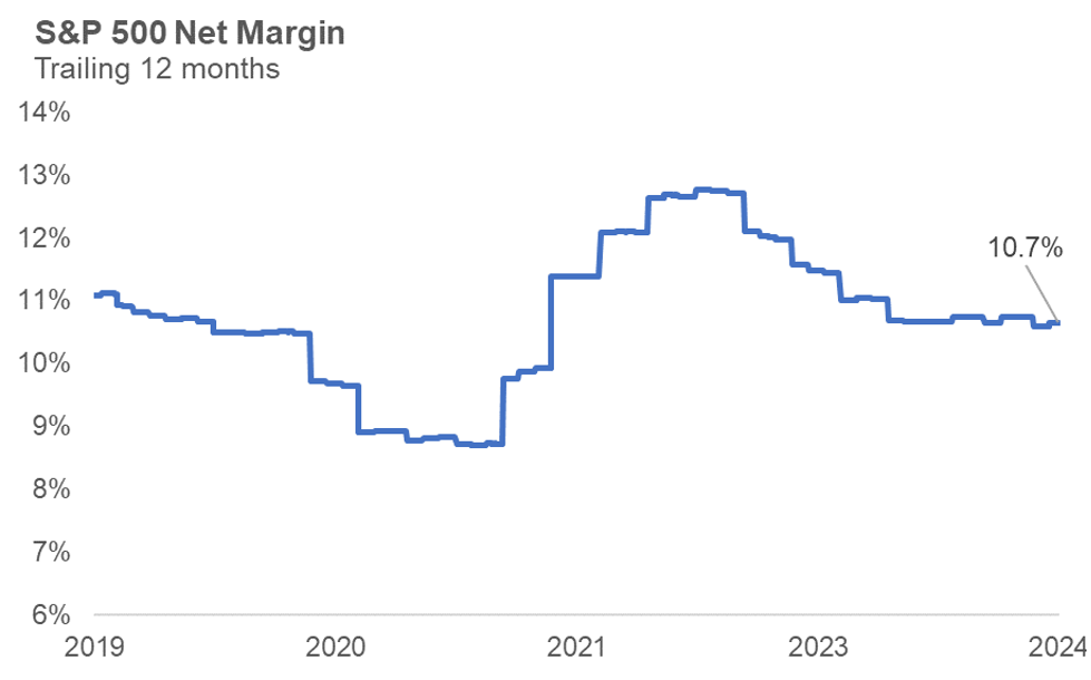 As companies report earnings, an updated picture of margins across the index emerges. Margins are generally a very stable series, but as the chart below shows, the last five years have seen significant movement. From the pandemic lows to the euphoria of 2021, followed by rising inflation in 2022 and 2023, the margin roller coaster has flattened out at a healthy level just under 11%.