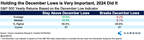 One of our favorite indicators at Carson Investment Research is the December Low Indicator, which is fairly straightforward. When the S&P 500 doesn’t close beneath the December low in the first quarter, the market has typically been positive the rest of the year. The opposite, of course, is when the December lows are violated in the first quarter. Last year, the S&P 500 didn’t break the December low, and it was a great year. However, a break in early 2022 indicated elevated odds that the rest of the year could be dicey. Given that stocks didn’t break their December low this year, this signal is less worrisome.