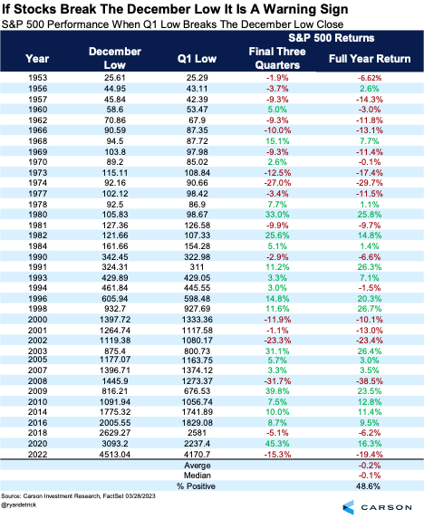 The chart below shows each instance the December lows were broken. The full year and the following three quarters’ returns were much weaker. These include some of the worst years in stock market history, including 1973, 1974, the tech bubble, 2008, and 2022.\