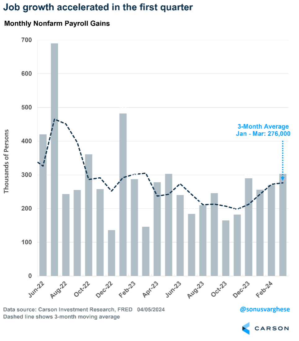 Payroll growth picked up in recent months. The economy created 303,000 net new jobs in March, which was well above expectations for a 214,000 increase. With positive revisions to January and February, payroll growth averaged 276,000 a month in the first quarter. That’s coming off an average of 212,000 in the fourth quarter of 2023. For perspective, payroll growth averaged 166,000 in 2019.
