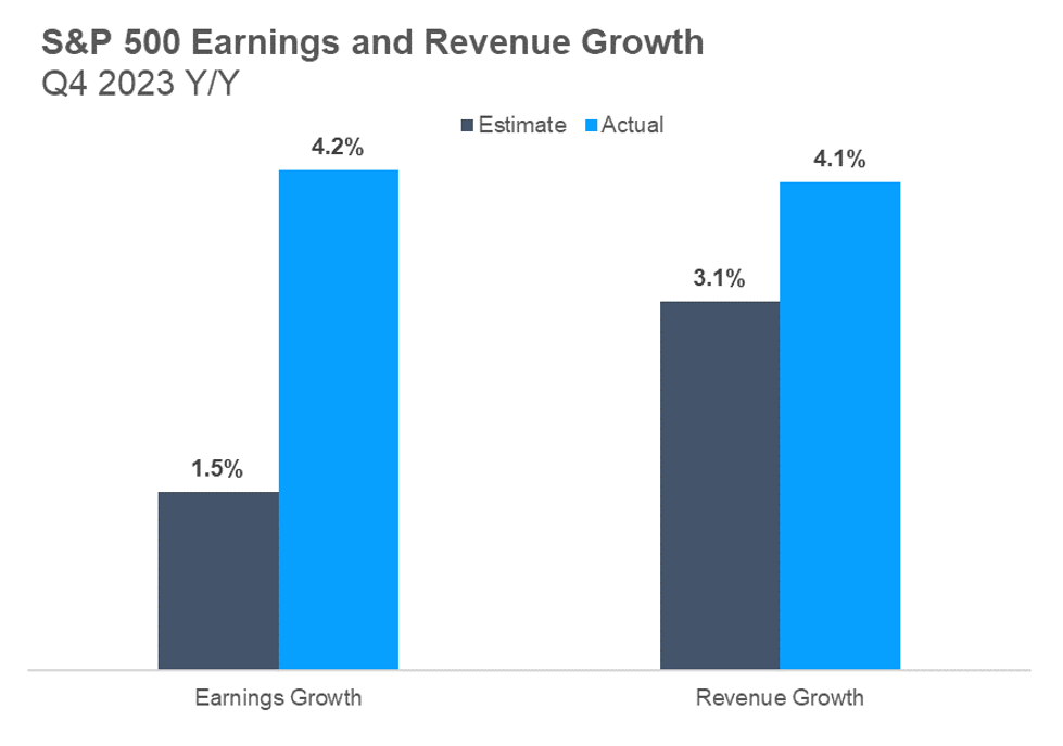 Over the long term, earnings growth drives stock prices. Over the last five years, earnings have contributed more to stock price growth than other factors, specifically multiple expansion (stocks getting more expensive). Throughout the first quarter, earnings results for the fourth quarter of 2023 were reported. Not surprisingly, companies continue to exceed expectations and prove their resilience. Prior to the reporting season, analysts expected S&P 500 companies to grow earnings by 1.5% and revenues by 3.1%. As it turns out, 73% of companies exceeded earnings estimates, and another 65% beat on revenues — both numbers are above recent and long-term averages. This resulted in 4.2% reported earnings growth and 4.1% reported revenue growth, which are strong year-over-year numbers.