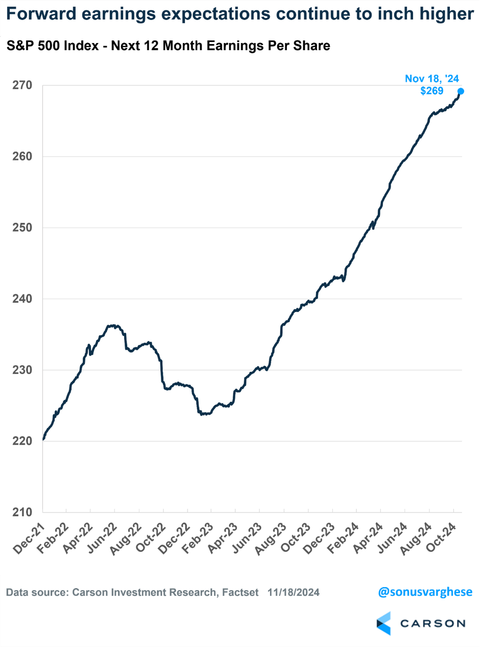 Looking forward at 12-month S&P 500 earnings we once again see new highs, all the way up to $268, up from $225 in early 2023. Now that’s a reason to be thankful! There is no holy grail when it comes to investing, but when we saw earnings estimates making hew highs back in the middle of 2023, we took it as a big reason to be overweight equities and still do.