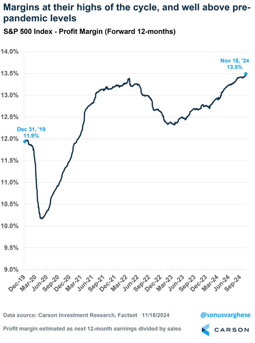 It doesn’t stop there though, as profit margins continue to trend higher and are at their highest level this cycle. Profit margins expanding and earnings hitting all-time highs are great dual tailwinds for higher stock prices.