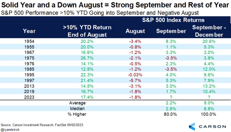Examining previous years that were lower in August but up more than 10% heading into September shows that stocks closed higher eight out of 10 times. Importantly, the rest of the year was higher every time.