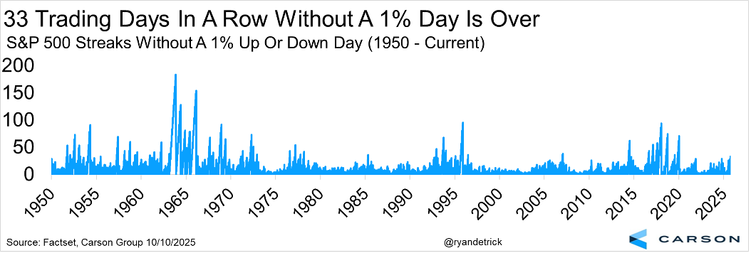 As of now, we don’t anticipate the trade war to heat back up, but one thing to note is stocks were probably due for some volatility. In fact, the S&P 500 went all of the usually volatile month of September without a 1% daily change (higher or lower) and had gone 33 days in a row without a 1% move, the longest streak since before Covid. Couple that with a five-month win streak and one of the best six-month rallies ever and the bottom line is stocks were likely due for some October volatility.