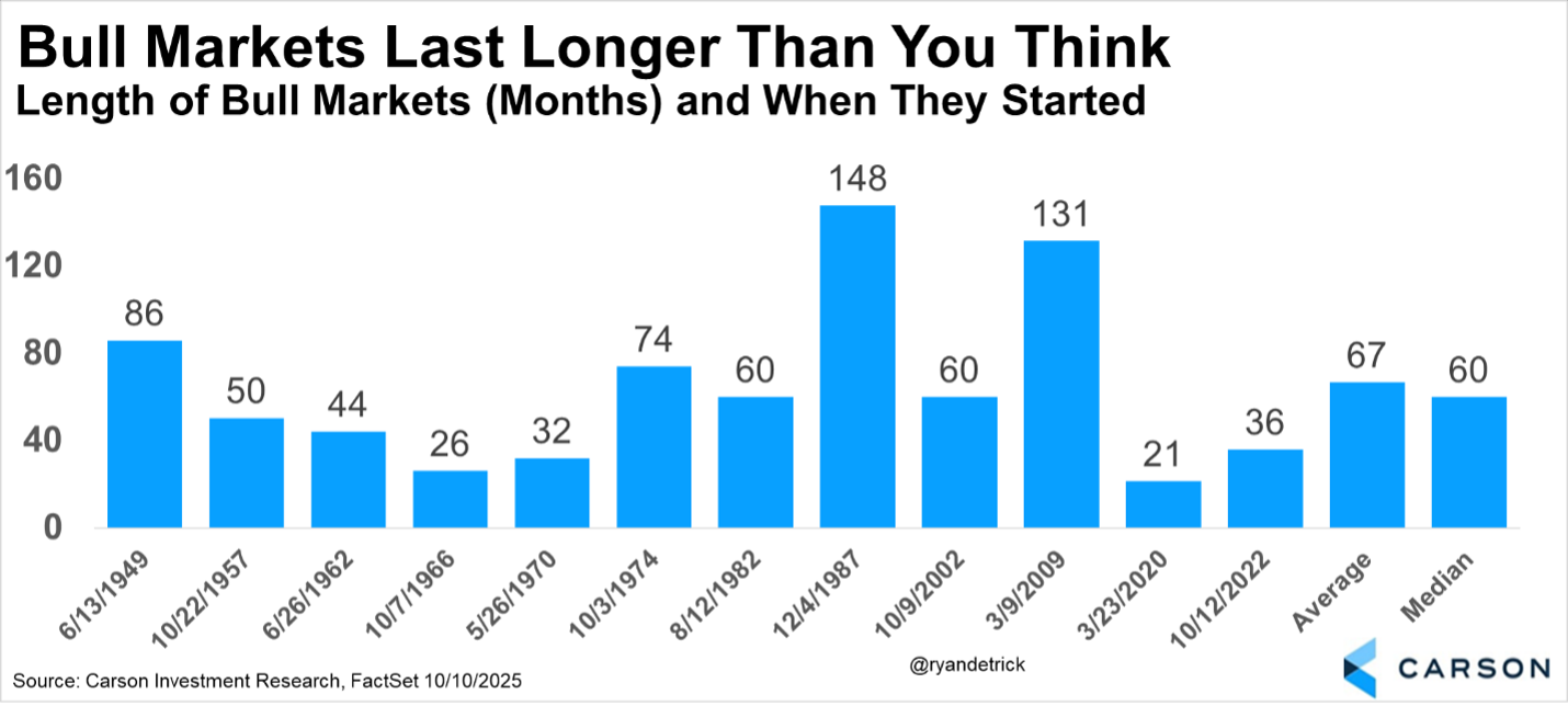 For those of us getting older, we like to say that age is just a number. Markets like to say that as well. In fact, looking at the 11 bull markets since World War II, the average one lasts more than five years.