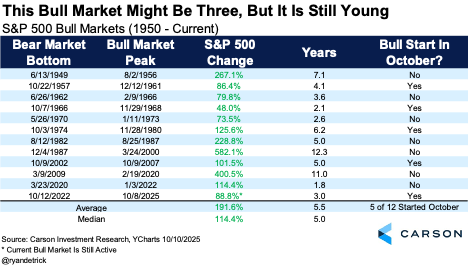 Can you believe it? The bull market turned three on Sunday. It might feel like a lifetime ago, but three years ago on October 12, 2022, the S&P 500 was down 25% from peak and in the depths of a vicious 10-month bear market. Investors may forget this now, but most of the high-flying technology and AI leaders right now were actually cut in half or more back in 2022. Many might recall the bear market of 2022 as a minor blip after the rally we’ve seen, but for those of us that were there, it wasn’t a fun time for investors. Interest rates soared, the Federal Reserve was hiking rates unlike anything seen in a generation, and inflation was rampant. Then a funny thing happened—stocks bottomed and have been climbing ever since.