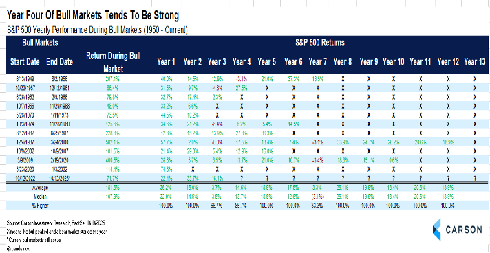 Of course, markets are driven by what’s happening now and not by past history. Otherwise this would all be easy. But history does suggest what may be ahead, and often for good macroeconomic reasons, which is why we study it. Right now, even with Friday’s renewed trade fears (which may not be over), we believe there are enough good things happening in the economy to act as a buffer against the risks we’re seeing. That includes fiscal and monetary stimulus, massive AI spending, still strong consumer and corporate balance sheets, and strong corporate profits. We’re not saying things can’t be derailed, just that there are enough good things going on to pay heed to what market history is telling us.