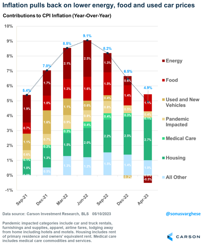 - Energy, food, and used car prices have pulled inflation down from 9% in June 2022 to 4.9% in April 2023.