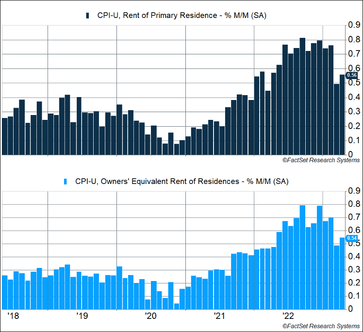 The main reason behind elevated core CPI inflation is housing inflation, which makes up 41% of the basket. Housing inflation, which is basically derived from rents (as opposed to home prices), has been running hot, around 8-9% over the past year.