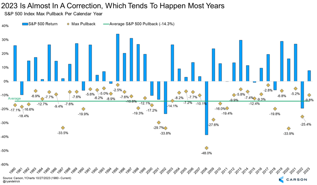 Stocks fell again last week, even as yields paused and overall earnings were solid. As of Thursday, the S&P 500 is down nearly 10% from its late-July peak. A decline of 10% or more would be classified as a correction. It’s important to know that 10% corrections occur most years. Since 1980, 22 out of 42 years saw at least one double-digit, peak-to-trough correction, with 12 of those years ending higher and gaining an average of 17.0%.