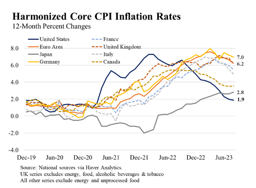 The inflation trajectory in the U.S. is also relatively positive. Despite the U.S. government pushing more fiscal stimulus into the economy, inflation in the U.S. is now running below many other developed economies. The chart below shows core inflation — excluding food, energy, and owners’ equivalent rent — enabling cross-country comparisons.