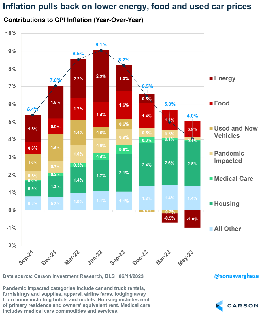 Headline CPI inflation has decelerated from a peak of 9.1% year-over-year in June 2022 to 4% in May. Over the past three months, inflation has run at a 2.2% annualized pace, the slowest three-month pace in two and half years.